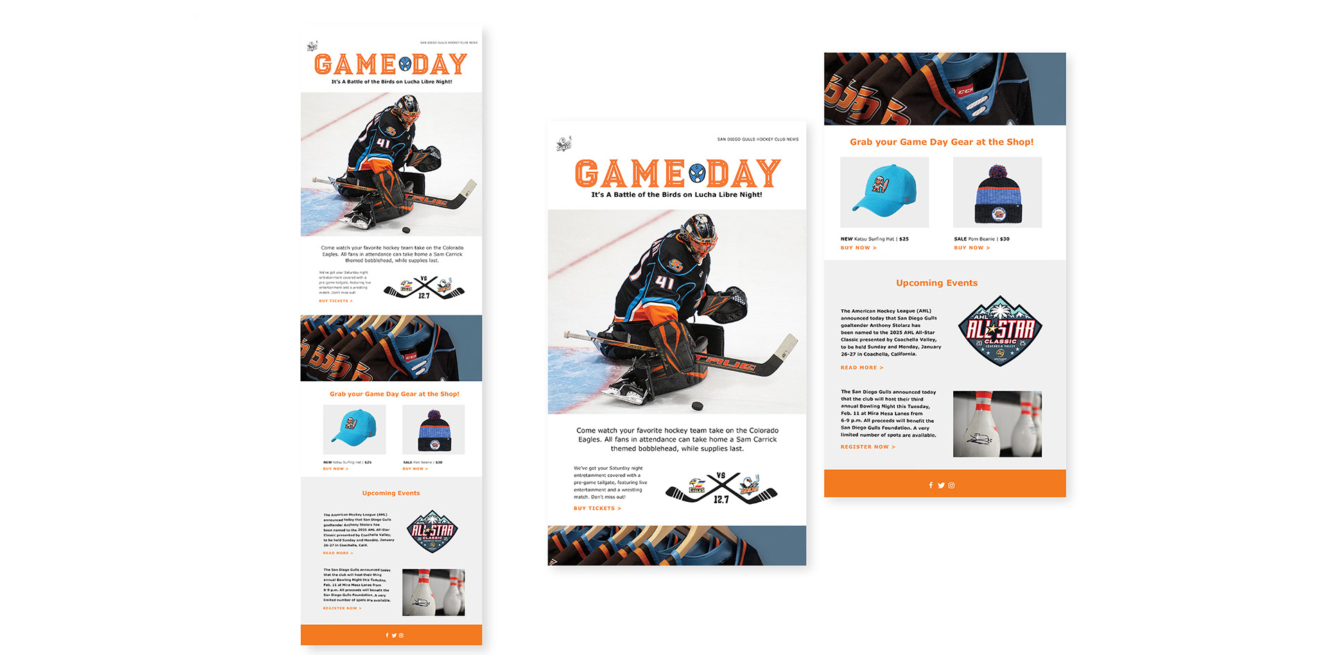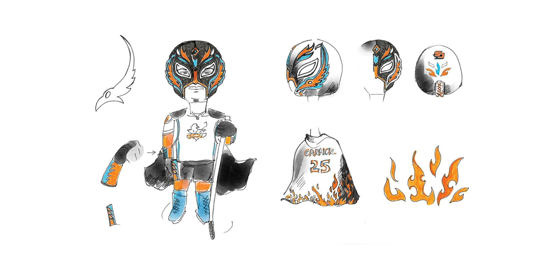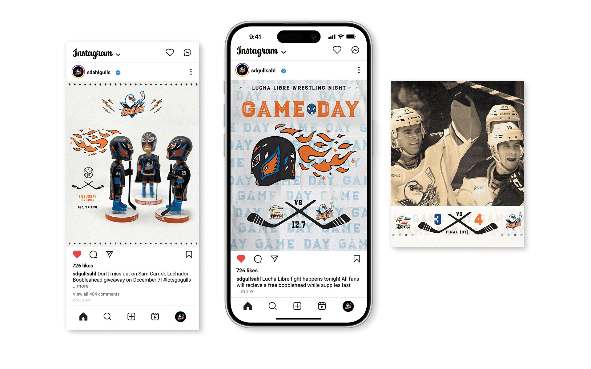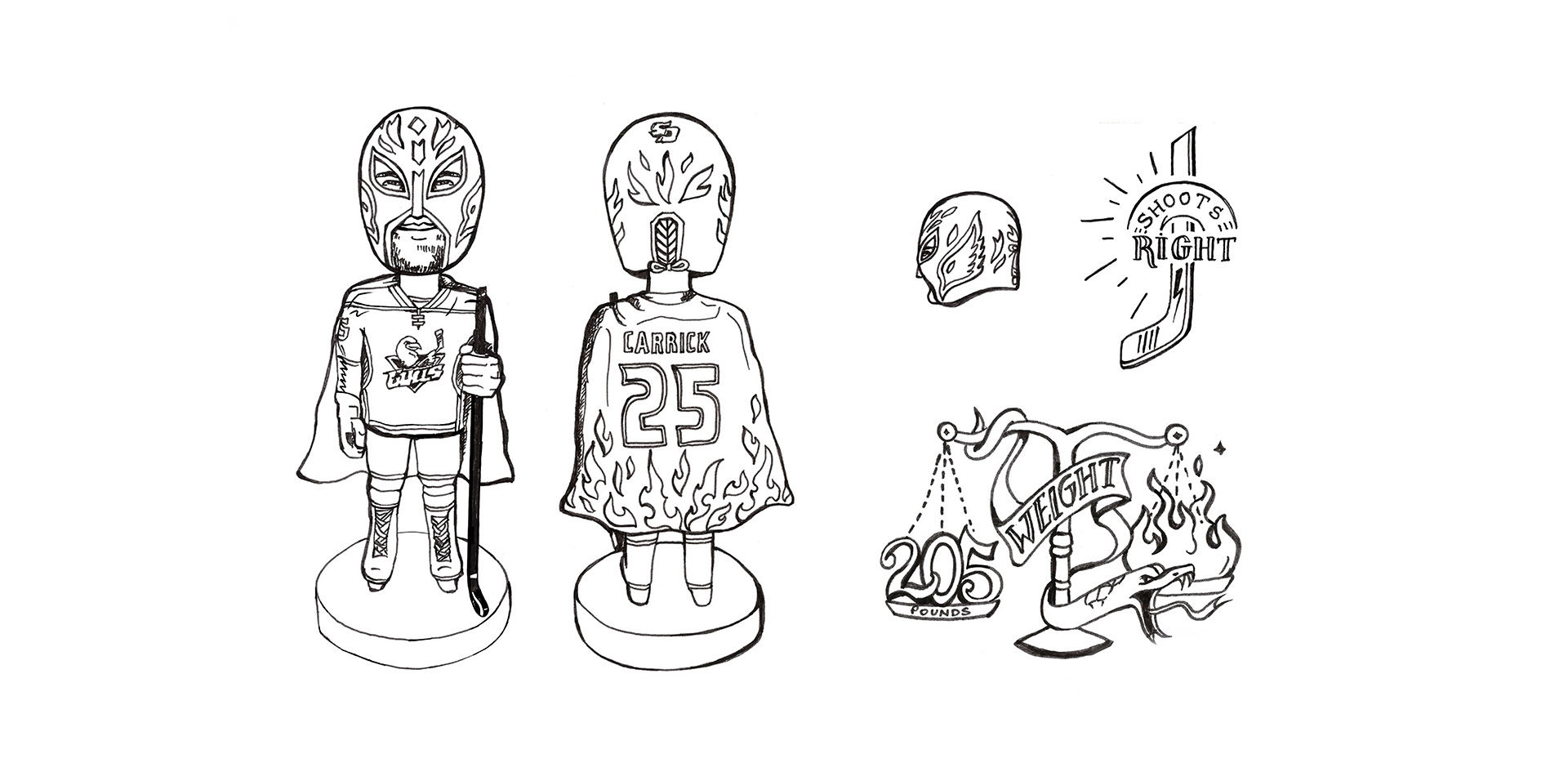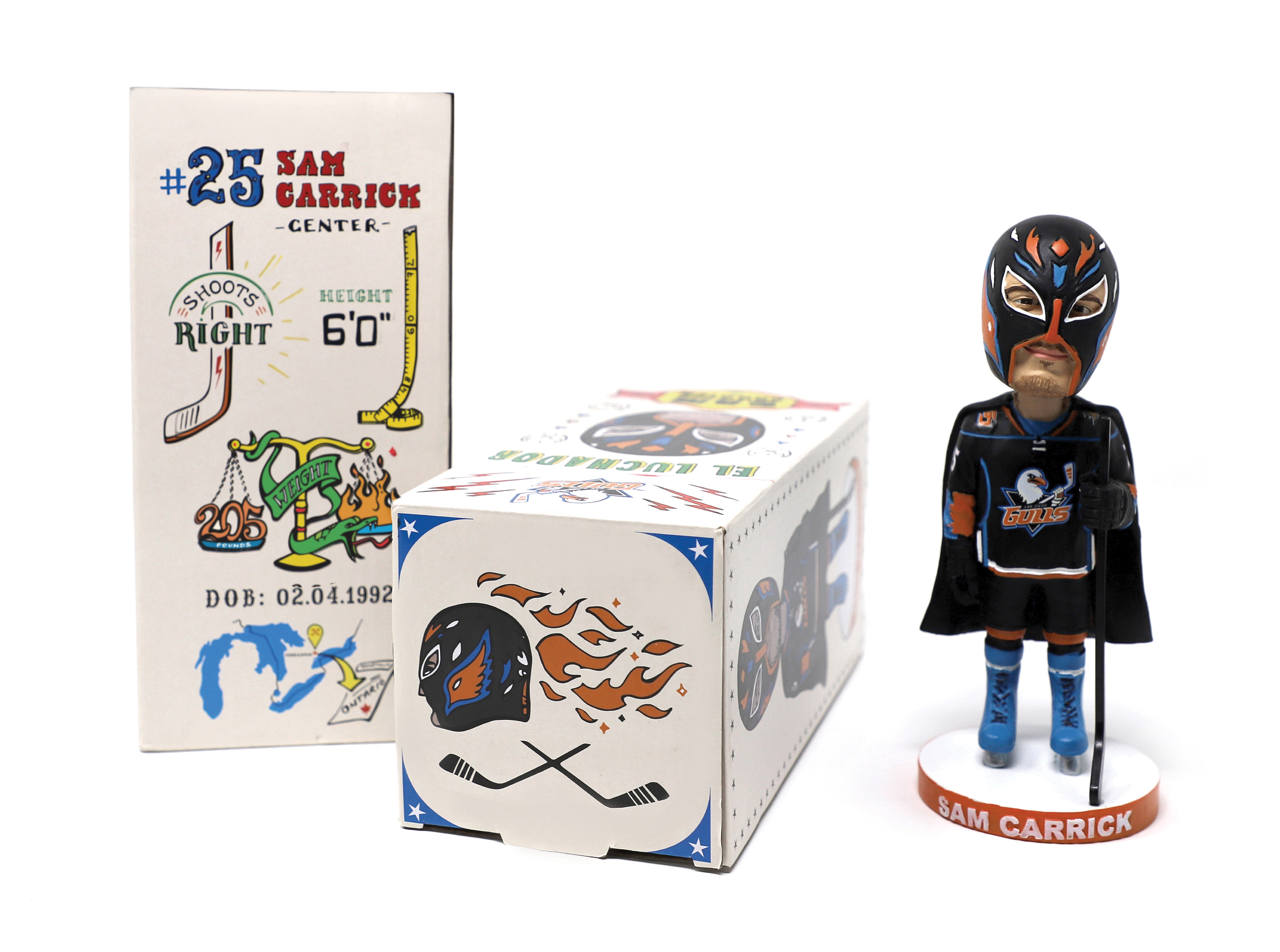 A one-of-a-kind Lucha Libre Wrestling Night bobblehead was created for the San Diego Gulls, from initial sketch to final production. Inspired by Mexican wrestling while maintaining the team’s brand identity, this piece was part of a larger themed campaign.
